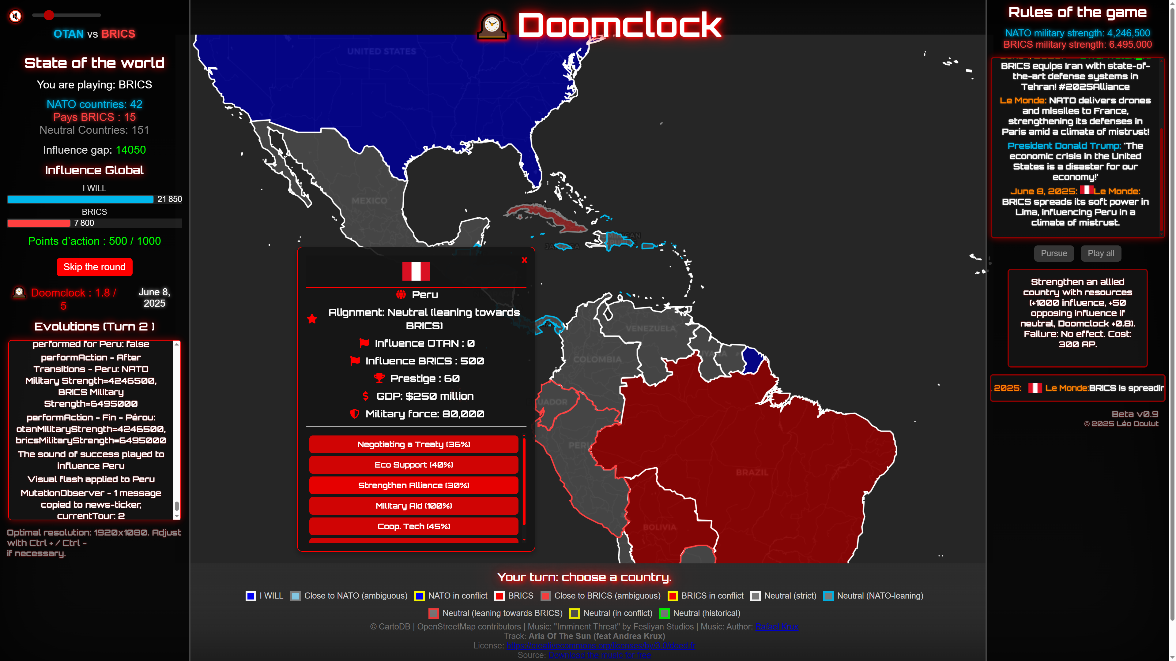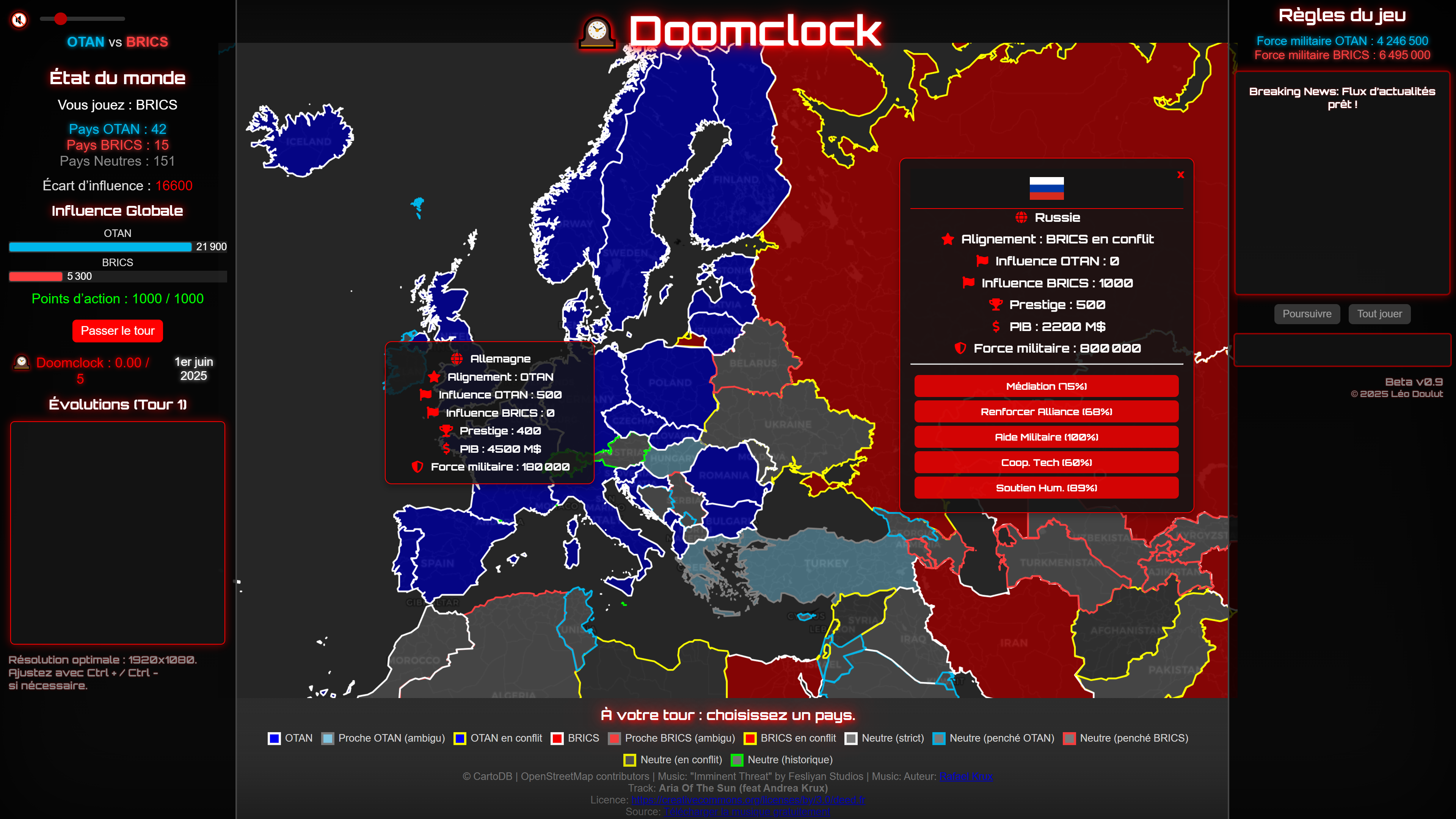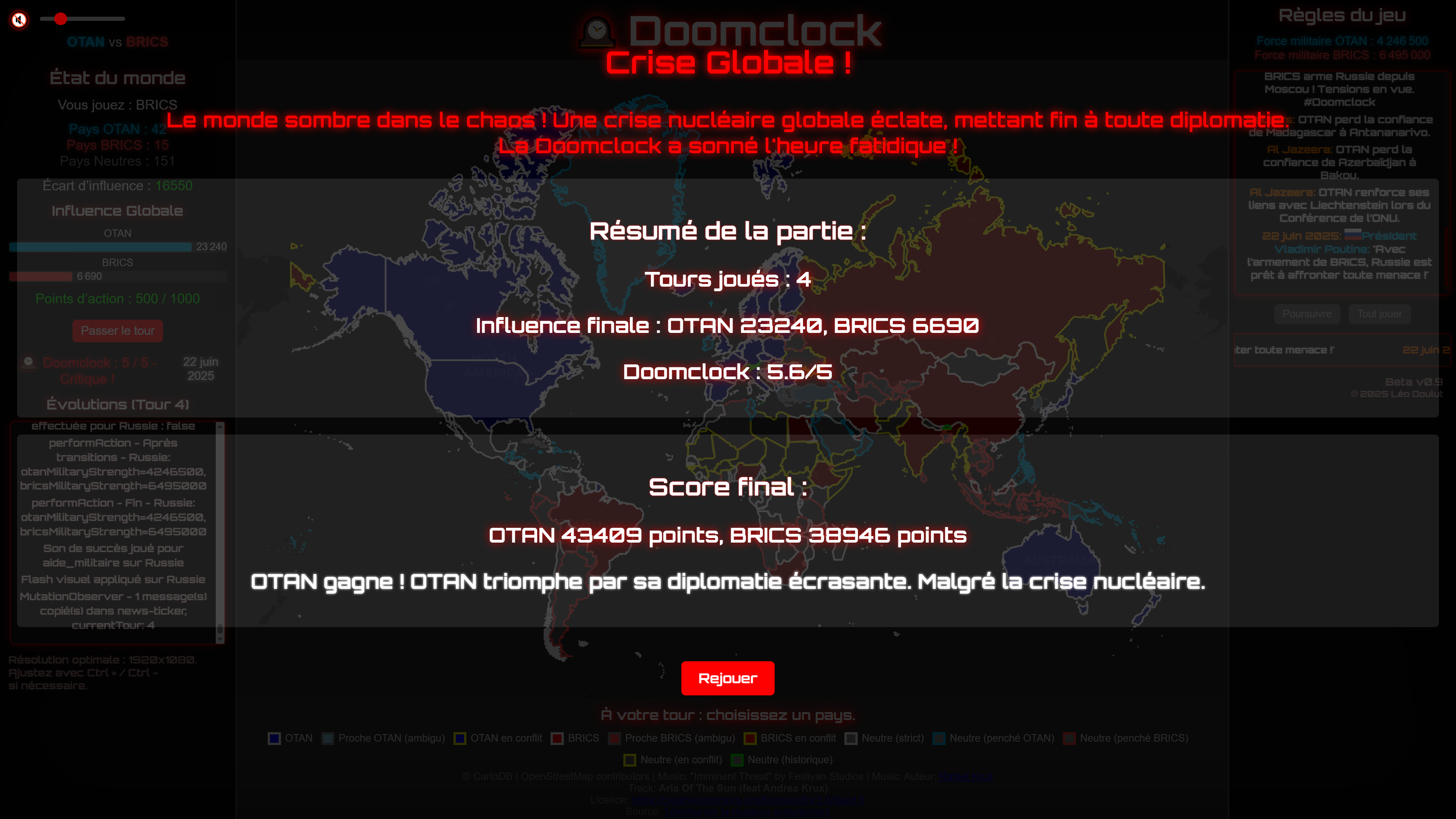 - Influence mondiale : Chaque action modifie l’écart d’influence entre OTAN et BRICS. Un écart réduit stabilise le monde, un fort déséquilibre peut accroître les tensions et augmenter la Doomclock.